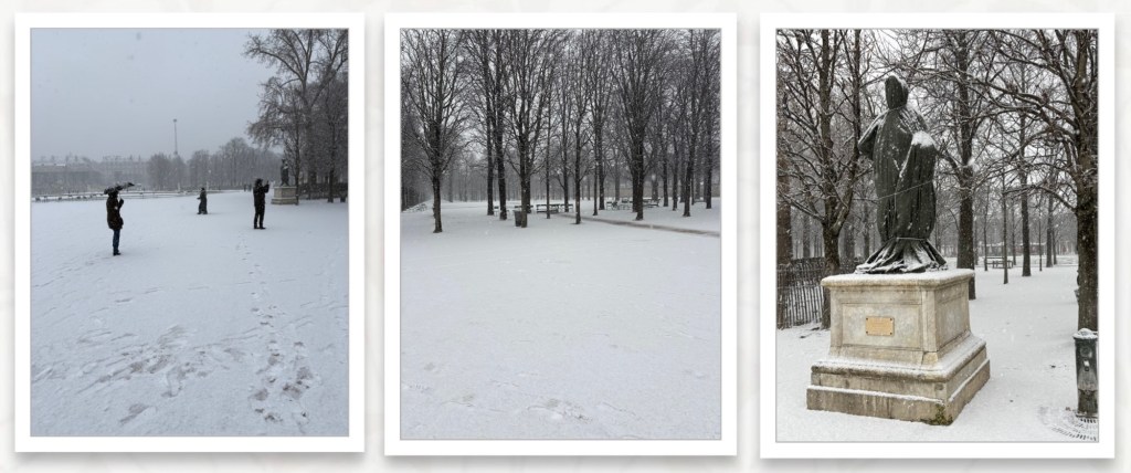 Nous quittons l’Orangerie. La neige crisse sous nos pas. Un japonaise très sophistiquée mais mal avisée passe devant nous, vêtues d’une mini-jupe, jambes nues, pieds nus dans de fins escarpins qui disparaissent sous la neige. On pardonne; le spectacle est trop beau.